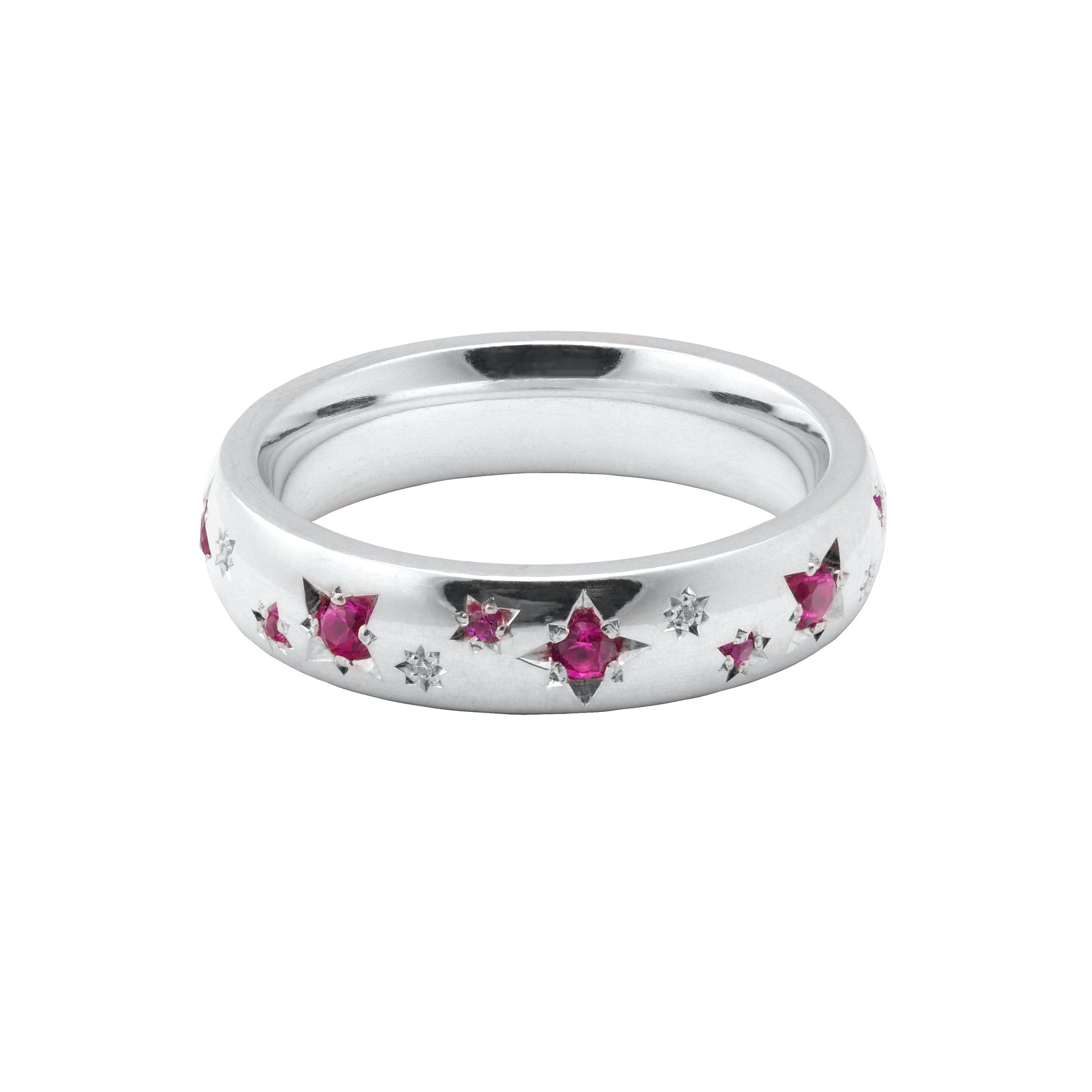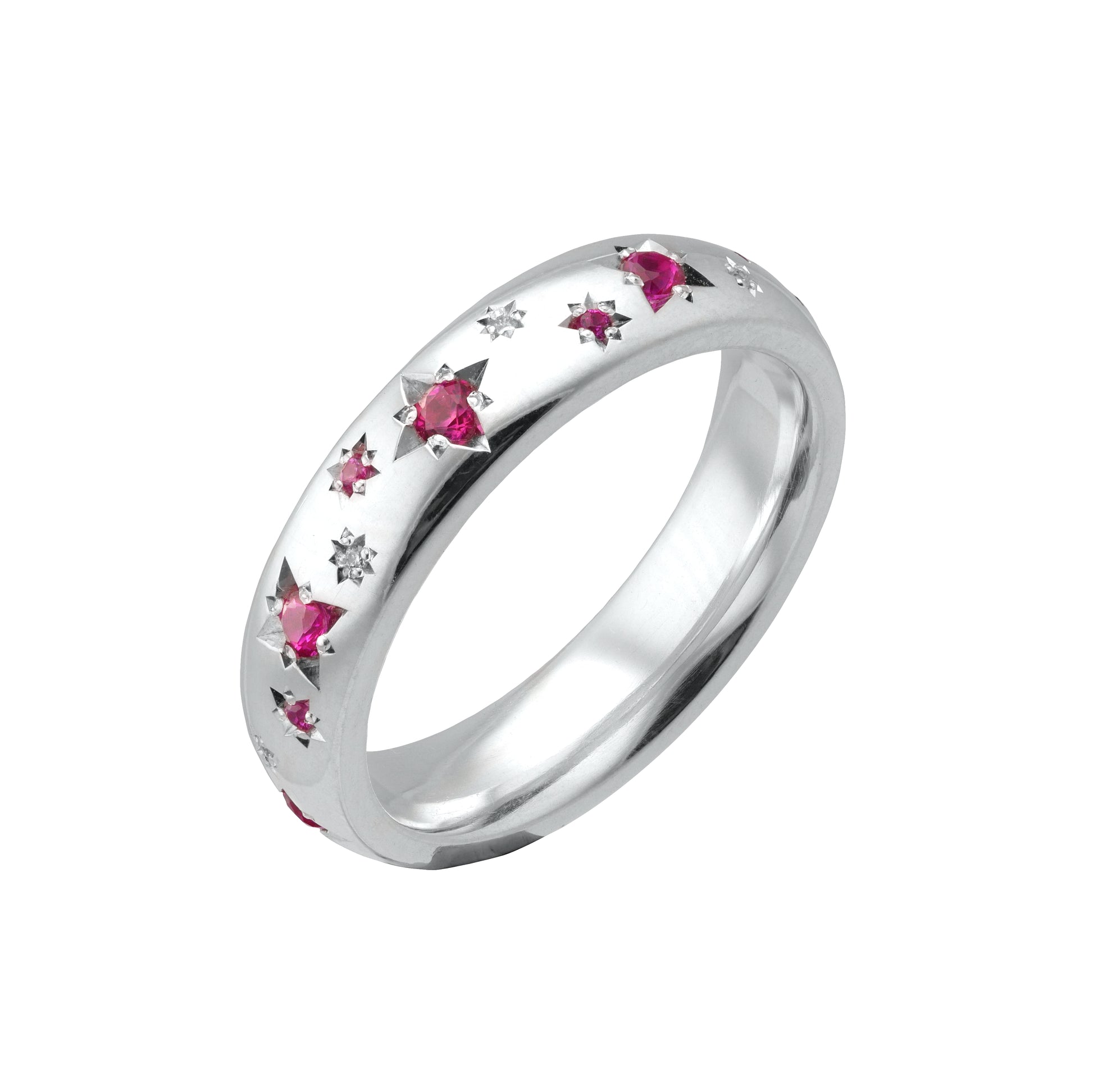 A slimmer version of the classic court profile ring in silver, adorned with stars of alternating diamond and ruby.